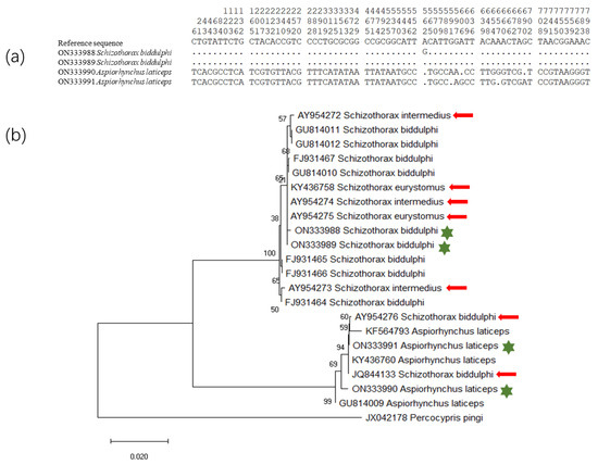 Comparative analysis of cytb gene of Aspiorhynchus laticeps and Schizothorax biddulphi. (a) Variable sites of aligned four haplotypes. (b) NJ phylogenetic tree of cytb haplotypes in Schizothoracin with cytb sequence of Jinsha perch carp (Percocypris pingi) as outgroup. Red arrows marked the wrongly clustered sequence, while green asterisk represented four haplotypes of this study.