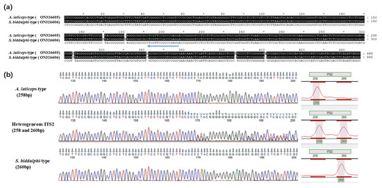Genotypes of internal transcribed spacer 2 (ITS2) in Aspiorhynchus laticeps and Schizothorax biddulphi. (a) Differences in ITS2 between Aspiorhynchus laticeps and Schizothorax biddulphi and position of inner primer (indicated by the arrow) were displayed. (b) Overlapping peak causing two different lengths of ITS2 sequences in the same individual result in sequencing failure.