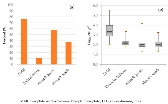 (a) Percentage of positive samples for the analyzed parameters in the microbial analysis and (b) microbial load of positive samples (line: mean, box: 25th–75th percentile, whisker: box +/− 1.5 interquartile range).