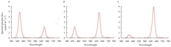 Spectral distribution of the LED lamps of RB3:7 (A) RB7:3 (B) and RB9:1 (C) used in the experiment.