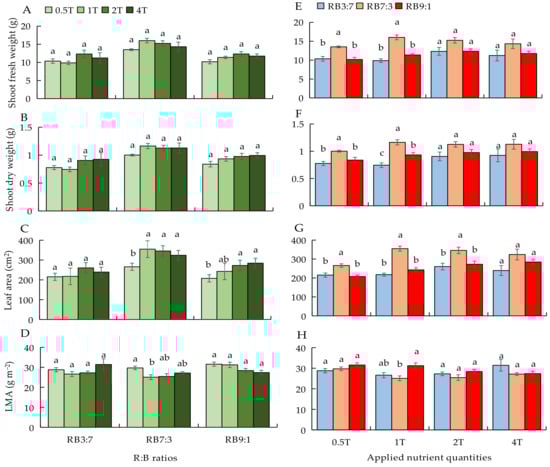 Shoot fresh (A,E) and dry weights (B,F), leaf area (C,G), and leaf dry mass per area (LMA) (D,H) at 20 days after transplanting under different ANQ treatments and R:B ratios. 0.5T, 1T, 2T, and 4T represent 4 different ANQ treatments, respectively. RB3:7, RB7:3, and RB9:1 represent R:B ratios of 3:7, 7:3, and 9:1, respectively. The error bars represent SEs (n = 6). Based on Tukey’s new multiple range test at p < 0.05. Different lowercase letters represent significant differences among different treatments.