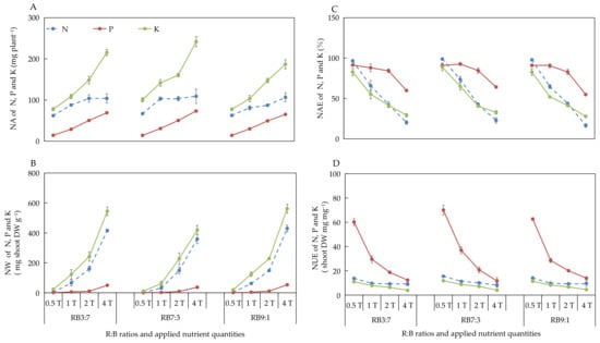 Nutrient absorption (NA) (A), nutrient waste (NW) (B) from producing 1 g shoot dry weight, nutrient absorb efficiency (NAE) (C), and nutrient use efficiency (NUE) (D) of shoot dry weight of N, P, and K after 20 days of cultivation under different ANQ treatments and R:B ratios. 0.5T, 1T, 2T, and 4T represent 4 different ANQ treatments. RB3:7, RB7:3, and RB9:1 represent the R:B ratios of 7:3, 3:7, and 9:1, respectively. The error bars represent SEs (n = 3).