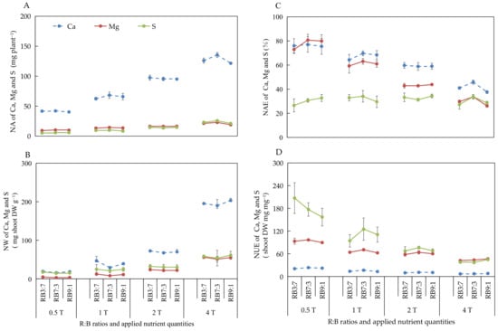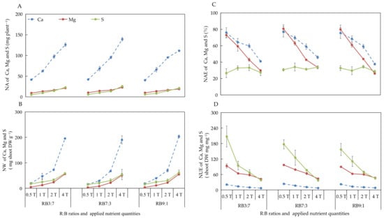 Nutrient absorption (NA) (A), nutrient waste (NW) (B) from producing 1 g shoot dry weight, nutrient absorb efficiency (NAE) (C), and nutrient use efficiency (NUE) (D) of shoot dry weight of Ca, Mg, and S after 20 days of cultivation under different ANQ treatments and R:B ratios. 0.5T, 1T, 2T, and 4T represent 4 different ANQ treatments. RB3:7, RB7:3, and RB9:1 represent the R:B ratios of 7:3, 3:7, and 9:1, respectively. The error bars represent SEs (n = 3).