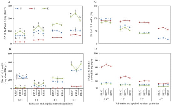 The NW of N and K was significantly decreased at RB7:3 compared with that at other R:B ratios under 0.5T and 1T. However, these parameters were not affected at different R:B ratios under 2T. Furthermore, the NW of N remained unaffected at different R:B ratios under 4T. The NW of K was significantly lower at RB7:3 than at other R:B ratios under 4T. No significant difference was observed in the NW of P among different R:B ratios, irrespective of the ANQ treatments (Figure 5B). The NAE and NUE of N, P, and K were not affected at different R:B ratios, irrespective of the ANQ treatments (Figure 5C,D).