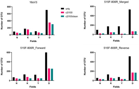 As seen in Figure 1, filtration of the data means a decrease in the number of OTUs detected in each field. In addition, it was observed that there is a slight difference between c2l100 and c2l100clean data when comparing both of them with uniq data. Importance of the ‘c2l100’ comes from elimination of the singletons. Singletons are sequences that represented in the data only once. Since it is quite difficult to obtain a single read from a complex sample, mostly they are classified as sequencing errors [31]. When detected OTUs were investigated in detail, it would seem that content of the uniq data was not specific for special conditions of fields. For analyzing the data more accurately, additional filters were applied. With the c2l100 filter, results became more customized. However, the application of an additional clear filter caused data loss. This part of the study suggests that the c2l100 filter will obtain the best result. When merged and separately analyzed forward and reverse data belonging to 515F-806R primers were compared, it seems that the number of detected OTUs was lower in merged data. In addition to that, when both 16sV3 and 515F-806R primers were compared, 16sV3 showed more OTU matches.
