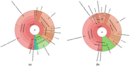 Krona chart results obtained from Yozgat-Boğazlıyan field for c2l100 filter; (a): 515F-806R_Reverse; (b) 16sV3. Results belong to the pool of triplicate PCR pools of 4 field samples (12 in total).
