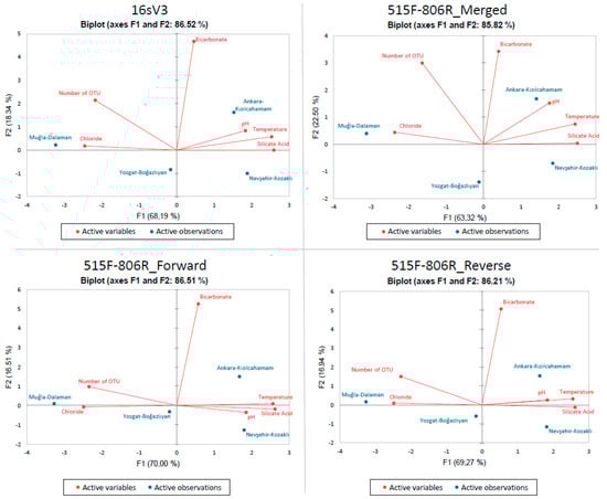 With this analysis, it was observed that number of OTU is positively correlated with chloride while not correlated with bicarbonate and negatively correlated with temperature, pH, and silicate acid. When the results shown in Figure 3 were analyzed in terms of fields, there was no direct relation observed (Supplementary Table S4).