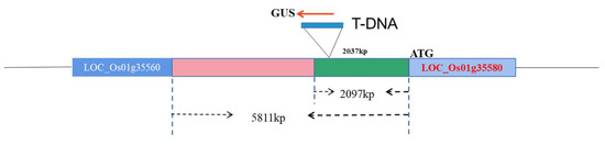 Japonica rice (Oryza sativa subsp. Japonica), a fine variety was used as a receptor. An independently constructed rice T-DNA insertion mutant library promoter (Figure 1), Escherichia coli strain DH5α, and Agrobacterium tumefaciens strain LBA4404 were preserved in the laboratory. The promoter expression verification vector pCXGUS-P was constructed and provided by Dr. Chen Songbiao [29].