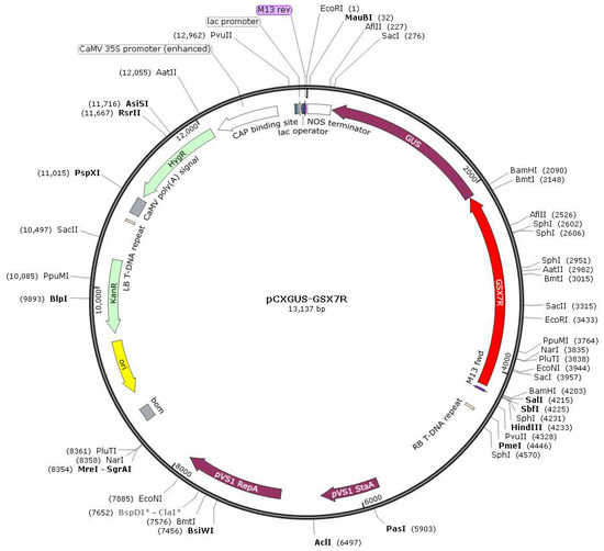 3.6. Evaluation of the Ability of GSX7R Promoter to Drive Foreign Genes