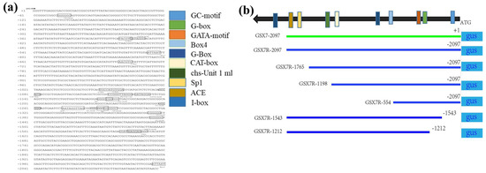 The location of putative cis-acting elements in GSX7R predicted by the PlantCARE database and schematic diagrams of promoter deletion constructs. (a) Putative cis-acting elements in GSX7R, The reverse 5′-region of the Os8GSX7 gene containing the 2097 bp promoter sequence from the translational start site. The transcription initiation site is defined as +1. The GC-motif, G-box, and other key cis-acting elements are underlined with and indicated by black frame as shown in the legend and different colors outside. The position of each element is also indicated by schematic diagrams; (b) The schematic diagrams of the truncated GSX7R constructs. The numbers to the left of these diagrams indicate the position of the 5′-deletion or 3′-deletion.