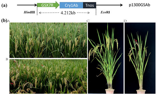 Schematic diagram of vector construction and bioassays in the field. (a) GSX7R:Cry1Ab:p1300GSAb plant transformation vector containing the Cry1Ab gene driven by the GSX7R promoter; (b) (A,C) Transgenic plants without any symptom of infestation in the whole-plant bioassay; (B,D) Wild-type plants showed white heads in the whole-plant bioassay. Red arrow indicates damage to YSB.