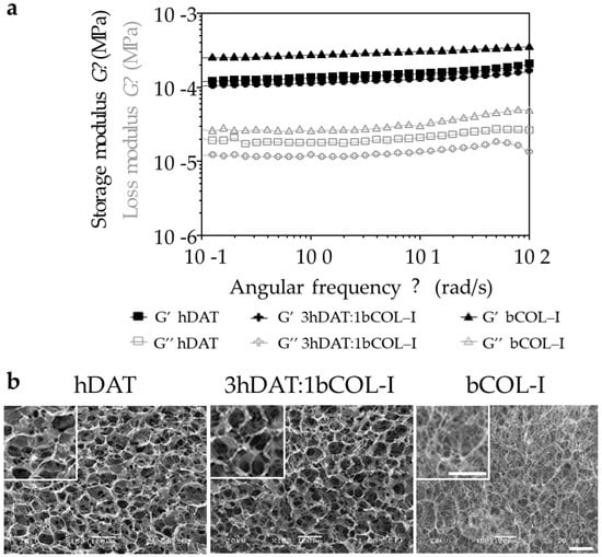 The viscoelastic behaviour of the solid foams showed higher G′ (storage modulus) values than G″ (loss modulus) during the entire range of frequencies, indicating the predominance of the elastic behavior over the viscous one for all assayed samples. Solid foams showed higher average storage modulus with the increase in bCOL-I quantity in the formulation: 152.8 ± 15.6 Pa, 128.0 ± 11.1 Pa, and 302.9 ± 22.2 Pa, for hDAT, 3hDAT:1bCOL-I, and bCOL-I, respectively (Table 1). In the same way, the degradation rate increased accordingly with bCOL-I content in the solid foam formulation, showing a degradation of 22.9 ± 11.9%, 26.1 ± 11.5%, and 61.95 ± 15.99% for hDAT, 3hDAT:1bCOL-I, and bCOL-I after 4 h of collagenase treatment, respectively (Figure 1 and Table 1). Thus, water absorption results could explain the water contribution to the overall resistance of the materials to deformation, and are in agreement with reologícal test results that show greater elastic or storage modulus (G′) in bCOL-I solid foams and greater viscous or loss modulus (G″) in hDAT and 3hDAT:1bCOL-I solid foams.