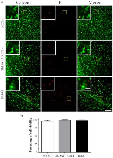 To assess cell viability in the different compositions of the hDAT, 3hDAT:1bCOL-I, and bCOL-I solid foams, freshly isolated and expanded hDPSCs were dissociated and cultured in the foams and were maintained for 72 h until labeling to allow cells to integrate into the foam. Next, a colabeling of Calcein and Propidium Iodide (PI) was made to detect both cell viability (cytoplamic staining) and cell death (PI incorporation). Our results showed similar values with 97.5 ± 3.5%, 99.4 ± 0.6%, and 95.9 ± 2.8% cell viability values for hDAT, 3hDAT:1bCOL-I, and bCOL-I samples, respectively (one-way ANOVA p = 0.4615. Figure 2a,b).