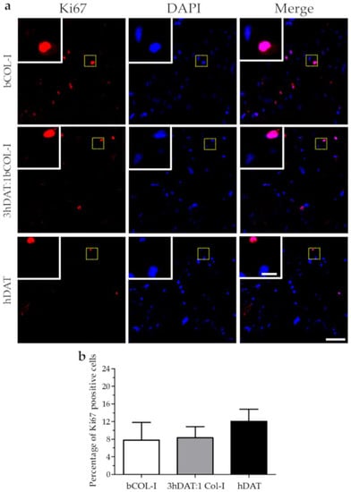 With regard to the ratio of cell proliferation analyzed by Ki67 staining, our results showed a hDPSC proliferation ratio of 12.1 ± 4.7%, 8.3 ± 2.6%, and 7.8 ± 4.0% for hDAT, 3hDAT:1bCOL-I, and bCOL-I solid foams, respectively, after 72h of culture (one-way ANOVA p = 0.3887. Figure 3a,b).