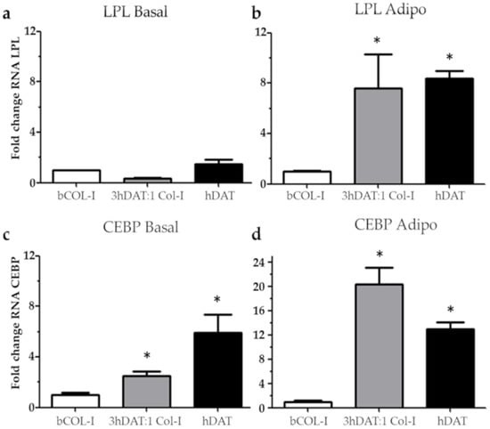 To assess the change of gene expression pattern towards adipocyte phenotype, cell-laden solid foams were subjected to adipogenic induction/differentiation using adipogenic culture medium for 14 days. Adipogenic markers, such as Lipoprotein lipase (LPL), an enzyme necessary for intracellular lipid accumulation [], and the CCAAT/enhancer binding protein (C/EBP) involved in adipocyte differentiation [] were analyzed by RT-qPCR. We did not find any statistical difference for LPL in basal conditions; ratios of 1.000 ± 0.006, 0.327 ± 0.083, and 1.470 ± 0.532 for bCOL-I, 3hDAT:1bCOL-I, and hDAT, respectively (Figure 4a). However, when cultured with adipogenic medium, we found an increase of 7.573 ± 4.737 and 8.373 ± 1-fold change ratios for 3hDAT:1bCOL-I and hDAT, respectively, with statistically significant differences between each type of solid foam (Dunn’s post-hoc, one-way ANOVA * p < 0.05. Figure 4b). For C/EBP, in basal medium conditions we found fold change ratios of 0.918 ± 0.066, 2.636 ± 0.272, and 5.930 ± 2.461 for bCOL-I, 3hDAT:1bCOL-I, and hDAT, respectively (Figure 4c). When cultured in adipogenic medium conditions, C/EBP fold change values increased to 20.280 ± 4.790 and 13.317 ± 1.314 for 3hDAT:1bCOL-I and hDAT solid foams, respectively, with statistically significant differences (Dunn’s post-hoc, one-way ANOVA * p < 0.05. Figure 4c,d).