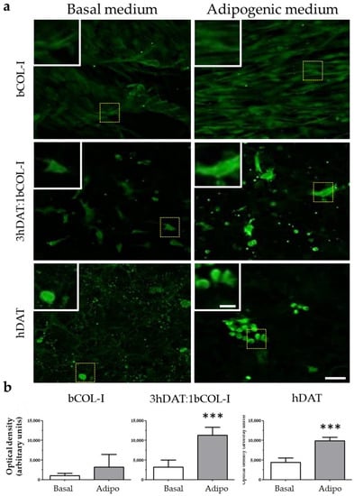 The over-expression of genes involved in adipogenesis prompted us to check the presence of the peroxisome proliferator-activated receptor gamma (PPAR-γ), a receptor found in adipose tissue and involved in a terminal adipocyte differentiation []. Positive cells for immunofluorescence against PPAR-γ were detected in hDAT and 3hDAT:1bCOL-I solid foams with both basal and adipogenic medium (Figure 5a). Quantification of the optical signal intensity (o.d.) showed no nuclear staining and no significant differences for bCOL-I foams between basal and adipogenic medium (1005.8 ± 581.9 o.d. for basal and 3229.2 ± 2617.1 o.d. for adipogenic medium, student’s t-test p = 0.1344). However, 3hDAT:1bCOL-I foams showed an increase of immunolabeling from 3193.5 ± 1804.1 to 11,280.5 ± 2049.4 o.d. (student’s t-test p < 0.0005) and hDAT foams also increased from 4429.5 ± 1091.3 to 9865.9 ± 877. 4 o.d. with a more nuclear immunolabeling pattern (Figure 5a,b, student’s t-test p < 0.0001).