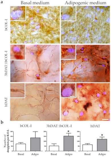 Lipid deposition staining of hDPSCs cultured in solid foams with basal or adipogenic medium for 14 days in culture. (a) Images of Oil red (red) counterstained with DAPI. Upper row: bCOL-I, middle row: 3hDAT:1bCOL-I, and lower row: hDAT solid foams (scale bars represent 50 µm, inset 10 µm). (b) Quantification of the Oil Red stained droplets of the different culture conditions. Student’s t-test * p < 0.05.