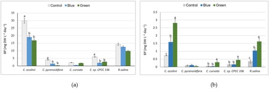 The studied cryptophyte strains were grown under various light conditions (control (white), blue, and green): (a) Biomass production (BP; mg dry weight L−1day−1); (b) biomass production per light unit (µmolphotons m−2s−1). Significant differences between samples are indicated with different letters as determined by ANOVA comparison (p < 0.05).