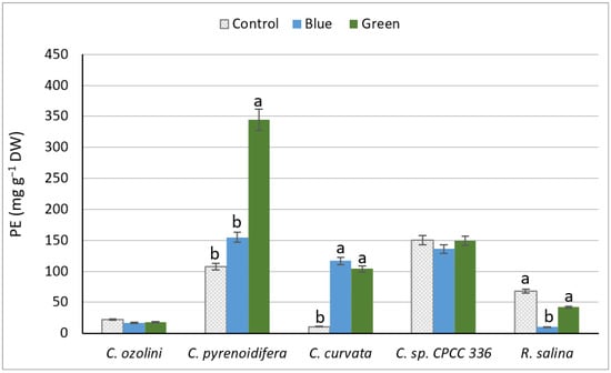 There was a significant difference between strains in PE production. The highest PE content was produced by C. pyrenoidifera under green light (p < 0.05), whereas the lowest PE content was detected for R. salina under blue light (Figure 2). The light conditions did not affect the PE content of C. ozolinii or C. sp. CPCC 336 (p > 0.05). However, C. pyrenoidifera had significantly higher PE content under green light (p < 0.05), and the PE content of C. curvata was higher under the low-intensity lights (blue and green) than under the high-intensity control light (p < 0.05). For the marine R. salina, there was no significant difference in PE content between control and green lights (p < 0.05), but the PE content was significantly higher under control and green lights than under blue light (p > 0.05). In general, strains grown under green light had significantly higher PE content than control and blue lights (Figure 2).