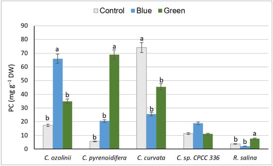 Since studies on the effect of light quality on algal PC are rare, we compare our results with certain studies on PC of plants. PC extracted from Gynura procumbens was higher under blue light than white light [72], similar to our results of C. ozolinii, C. pyrenoidifera, and C. sp. (CPCC 336). Pachyrhizus erosus cultured under different LED lights produced more PC under blue light, followed by white and green lights [73], as did C. ozolinii and C. sp. (CPCC 336) in our study. This is likely because blue light affects the activity of the phenylalanine ammonialyase enzyme (PAL), a key enzyme in the phenol synthesis pathway and accumulation [74,75].
