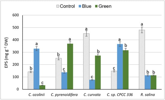 The results of our study indicated a species-dependent response to the effect of light changes on EPS production, similar to marine diatom studies showing that the process of EPS execration is species-specific [76]. Although our strains grew better under control light, some of them (C. ozolinii, C. pyrenoidifera and C. sp. CPCC 336) produced the highest quantity of EPS under blue and green lights. Similar to our results from C. ozolinii and C. sp. CPCC 336, blue light favored the EPS production of the red algae Porphyridium cruentum and cyanobacterium Nostoc flagelliforme [77,78]. On the other hand, blue light was the least favorable for EPS production of P. sordidum [66] and our C. pyrenoidifera and C. curvata. Similar to C. curvata and R. salina in our study, P. purpureum, P. sordidum, and N. calcicola had their highest EPS content under white light [79,80]. Green light led to the highest EPS production in our C. pyrenoidifera, and similar results have been obtained for P. cruentum [81].