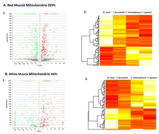 Group 1 consisted of the proteins that were significantly more abundant, and group 2 consisted of less abundant proteins in the two icefish species when compared with the red-blooded species (Table 1, Table 2, Table 3 and Table 4). The reported significance value is the –log10 p value, with the null hypothesis being that the protein is of equal abundance in all samples. The higher the significance value the greater the probability that the protein is not equal in abundance in all groups. The volcano plot distinctively shows the significant differentially expressed proteins (DEPs) (q < 0.05) that were downregulated (green) and upregulated (red). The WMM had fewer proteins that were not significant when compared to the RMM. A heat map that includes the differentially expressed proteins (DEPs) in red muscle (Figure 1(A2)) and white muscle (Figure 1(B2)) mitochondria illustrates that protein expression profiles are characteristic for the haemoglobin-less species when compared with red-blooded groups. The mapped ion areas were converted to relative percent values by weighting each protein equally to point out differences between groups.