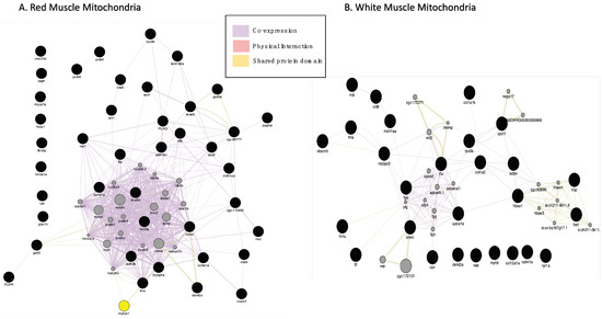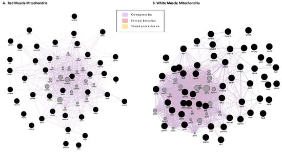 GeneMANIA (based on zebrafish) analysis for interactions of the proteins with increased abundance in icefish produced one network per each muscle tissue (Figure 2A,B). In RMM, co-expression occupied 98.66% of the interactions seen in the network; shared protein domains occupied 1.13%; physical interaction, 0.21%. The network showed shared domains among proteins slc25a5, slc25a6, slc25a20, vdac3 and slc25a12, and, between atp5a1 and atp5b. The network showed physical interactions between atp5a1, atp5o, predicted cyc1 and coq9. In WMM, co-expression occupied 98.46% of the interactions seen in the network; physical interactions occupied 1.431%; and shared protein domains occupied 0.11%. The network showed physical interactions between ribosomal proteins and separately also between proteasome proteins.