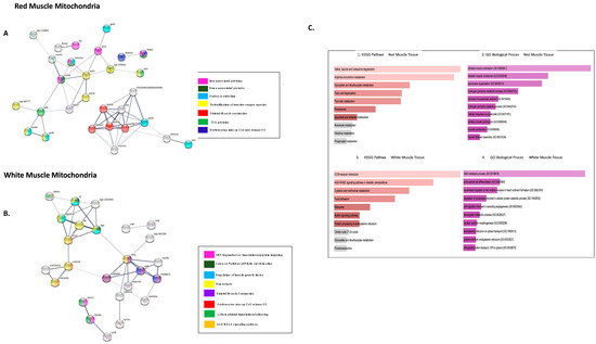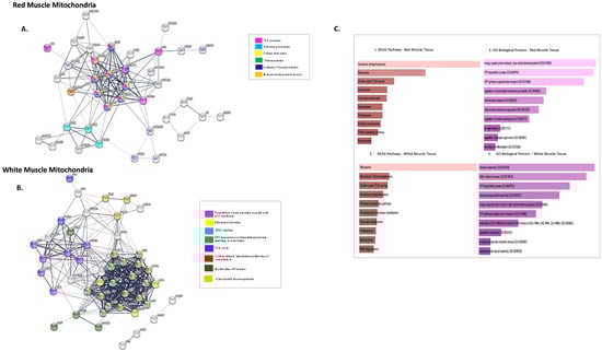 Network analysis of more highly abundant proteins in icefish mitochondria compared with closely related red-blooded species. (A) RMM DEPs, number of nodes 42 with 143 edges, the average node degree is 6.8 and (B) WMM, number of nodes 56 with 382 edges with an average node degree of 13.6. Network analysed using STRINGdb. The network highlights proteins involved in different pathways curated by STRINGdb from KEGG and Reactome databases. Nodes are coloured according to pathways. The edge shows type of interactions, experimentally determined interactions derived from databases, predicted interactions such as gene neighbourhood, gene co-occurrence, and gene fusions, respectively, co-expression interactions, text-mining interactions, and homology; the thicker the edge, the higher the confidence obtained by the mentioned sources. (C) Using FishEnrichr [39,40] analyser KEGG Pathways and GO terms for Biological process showed proteins in different pathways. The length of the bar represents the significance of that specific gene-set or term. Brighter colours are highly significant.