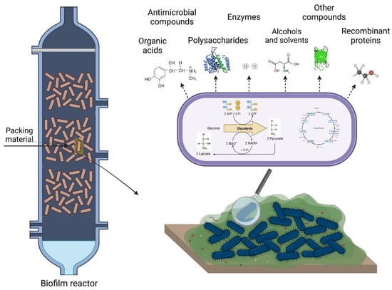 In recent years, microbial biofilms have emerged as a new generation of biocatalysts due to their potential for the sustainable production of added-value chemicals [16,20,21], including organic acids, enzymes, polysaccharides, antimicrobial compounds, alcohols and solvents, and other products (Figure 1). This production typically resorts to a variety of biofilm reactors in which microorganisms attach to support materials [11,17,18,19]. The most common reactor types used to produce these substances are stirred-tank [22,23,24] and packed-bed reactors [25,26,27]. The packed-bed reactor is usually filled with densely packed solid supports, which provide high interfacial areas, whereas stirred-tank reactors integrate inserts and/or particles [19]. Additionally, membrane biofilm reactors with a porous gas-permeable membrane (e.g., silicone [28,29] and polysulphone [30]) are often used for these bioreactions [28,29]. Other configurations include fluidized-bed reactors [31,32], airlift reactors [33,34], bubble column reactors [35,36], rotating-disk reactors [37,38], or tubular biofilm reactors [39]. Thus, the choice of the reactor and feeding strategy (batch, fed-batch, and continuous mode) should be molded to the process conditions and nutritional requirements of the producing microorganisms.