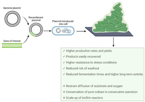 Recombinant proteins and other added-value compounds are being produced in biofilm reactors due to several advantages of this platform when compared to suspended cell systems. Biofilm reactors can (1) retain more biomass per unit volume, increasing production rates and yields, (2) resist stress conditions such as toxic compounds, (3) reduce the risk of washout (which eliminates the need for repeated inoculations during subsequent batch fermentation), and (4) reduce fermentation times and exhibit long-term activity [11,15,16,17]. However, some challenges need to be addressed, namely, (1) limitations of substrate and oxygen diffusion, which can increase population heterogeneity, (2) the complex maintenance of a pure culture in consecutive operations, (3) biofilm reactors are difficult to scale up [17], and (4) product secretion to the extracellular medium can be challenging, leading to difficulties in downstream processes [15].