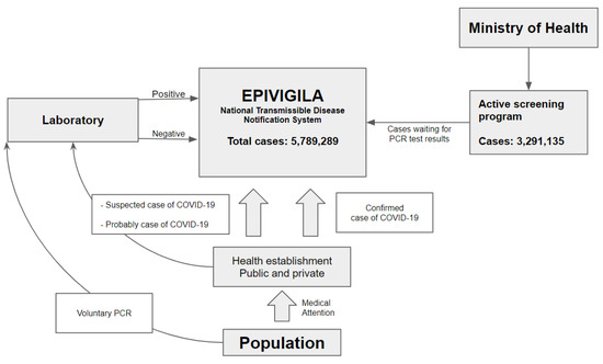 - Taramasco, C.; Rimassa, C.; Romo, J.A.; Zavando, A.C.; Bravo, R.F. Epidemiological surveillance in COVID-19 pandemic: EPIVIGILA system. Medwave 2022, 22, e8741. [Google Scholar] [CrossRef]