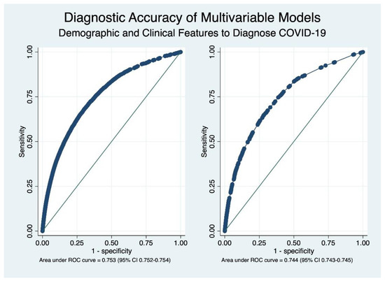 In order to facilitate the clinical use of these equations, a simplified model that considered four demographic characteristics (age, sex, type of insurance (private vs. other), and a history of belonging to an indigenous Chilean population) and the six most important clinical manifestations was estimated as well. These factors tended to maintain their strength of association that was calculated in the full model, as shown in Table 4. This simplified model showed a similar diagnostic accuracy when contrasted to the full model, with an AUC of 0.744 (95% CI 0.743–0.746). The comparative accuracy of both models is shown in Figure 2.