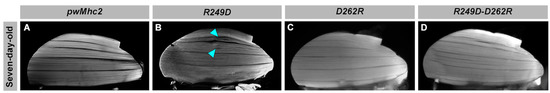 The following supporting information can be downloaded at: https://www.mdpi.com/article/10.3390/biology11081137/s1, Table S1: protein level; Table S2: pwMhc2 flight; Table S3: D262R flight; Table S4: R249D flight; Table S5: R249D-D262R flight; Table S6: ATPase data; Table S7: Motility data.