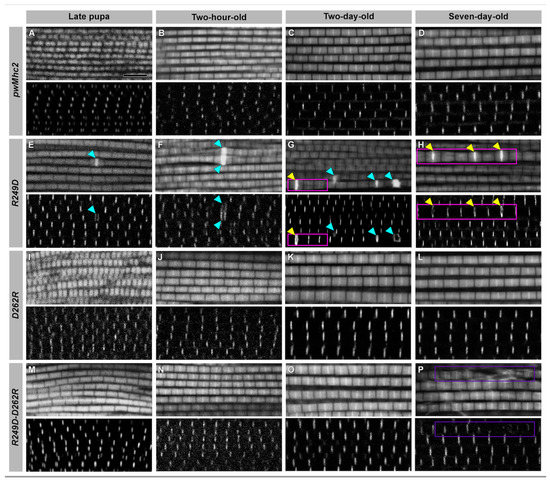 We examined sarcomere structure in the same fibers via confocal microscopy at each of the four developmental stages by staining for actin and for alpha-actinin, which localizes to Z-lines (Figure 3). While myofibrils from pwMhc2 wild-type control (Figure 3A–D) and D262R (Figure 3I–L) appeared normal, R249D myofibrils showed several irregularities (Figure 3E–H). These included myofibril branching (magenta boxes), thick Z-line-like structures that stain intensely with phalloidin (cyan arrowheads), and occasionally both (yellow arrowheads). These defects became more abundant and pronounced with age. Interestingly, myofibrillar defects observed via confocal microscopy were not evident in the R249D-D262R double-mutant myofibrils (Figure 3M–P) until 7 days of age, where we observed some myofibrillar damage (purple boxes), suggesting (at this level of resolution) that the D262R residue is able to suppress the early structural defects engendered by the R249D mutation.