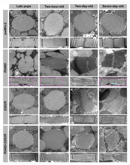 We next utilized transmission electron microscopy to determine effects of the mutations on myofibril structure and stability at high resolution (Figure 4). Sections of the pwMhc2 transgenic control appeared wild-type throughout development (Figure 4A–D). In transverse sections, myofibril morphology remained rounded during aging, with standard thick and thin filament double-hexagonal packing; in longitudinal sections, Z- and M-lines are normally arrayed to form sarcomeric structures. In contrast, R249D organisms show myofibril assembly defects that are exacerbated during aging (Figure 4E–H). Late-stage pupae and two-hour-old adults display assembly defects including gaps in myofilaments and sarcomere bifurcations (Figure 4E,F, magenta boxes). Two-hour-old R249D adults exhibit apparent compaction of myofilament arrays (Figure 4F, top). Two-day-old and seven-day-old R249D adults continue to display progressive disruption in muscle structure with further compaction of filaments, myofibrillar gaps, and myofibril branching (Figure 4G,H: magenta box), as well as apparent misplaced Z-line material/shortened sarcomeres (Figure 4H, cyan arrowhead). In contrast, D262R transverse and longitudinal sections from late-stage pupae and two-hour-old adults resemble those of the transgenic control (Figure 4I,J). While longitudinal sections from two-day-old and seven-day-old D262R adults display relatively normal sarcomeres, except for some gaps in filament packing, transverse sections show disruptions in thick and thin filament hexagonal packing (Figure 4K,L). For the R249D-D262R double mutant, transverse and longitudinal sections from late-stage pupae and two-hour-old adults (Figure 4M,N) resemble those of the transgenic control. This is significantly improved compared to late-stage pupae and two-hour-old adults of R249D (Figure 4E,F). Transverse and longitudinal sections from two-day-old and seven-day-old R249D-D262R adults (Figure 4O,P) are also improved compared to R249D (Figure 4G,H). Longitudinal sections of the double mutant show some gaps in the filament arrays and irregularities in sarcomere width, but lack the severe gapping, branching and Z-line displacement present in R249D. Transverse sections show that myofibril integrity is maintained fairly well in R249D-D262R two-day-old adults, except for fraying at the periphery, but this deteriorates at seven days (Figure 4O,P). Still, defects are not as severe as in R249D myofibrils at the same ages (Figure 4G, H), nor those in D262R transverse sections (Figure 4K,L). Overall, the high-resolution analysis indicates that while defects in assembly and/or maintenance of myofibrillar structure are evident in both the R249D and the D262R mutants, incorporation of both mutations into the myosin molecule yields normal myofibrillar assembly and better myofibril maintenance during aging.