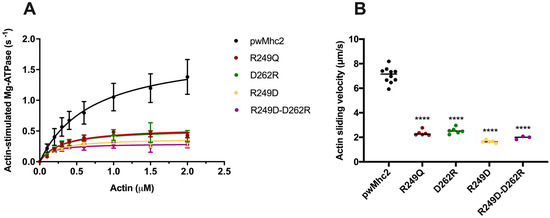 3.5. Effects of the R249Q, R249D, D262R and R249D-D262R Mutations on Myosin ATPase and Actin Sliding Velocity