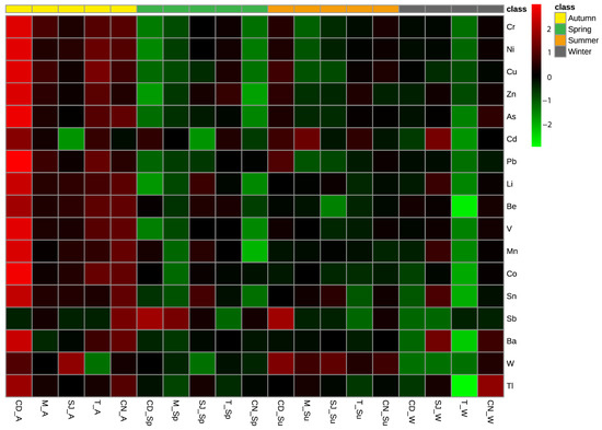 Heatmap comparing trace element concentrations (As, Ba, Be, Cd, Co, Cr, Cu, Li, Mn, Ni, Pb, Sb, Sn, Tl, V, W, and Zn) in sediments from sampling sites. CD, M, SJ, T, and CN represent the sites Cale do Ouro, Murtosa, São Jacinto, Torreira, and Costa Nova, respectively. A, W, Sp, and Su represent the seasons of the year: autumn, winter, spring, and summer.