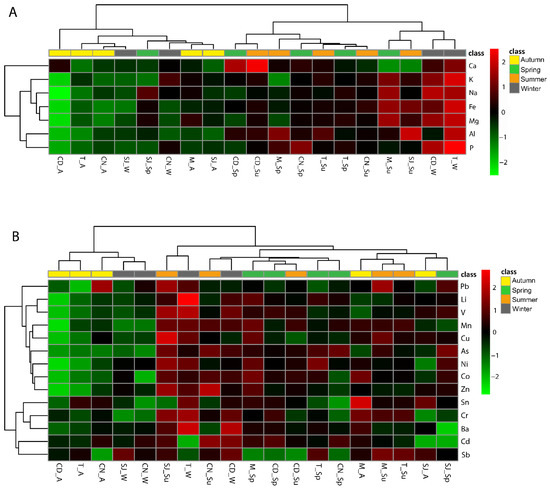 Heatmap with the biota–sediment accumulation factor (BSAF): (A) major BSAF (Al, Ca, Fe, K, Mg, Na, and P) and (B) trace element BSAF (As, Ba, Cd, Co, Cr, Cu, Li, Mn, Ni, Pb, Sb, Sn, V, and Zn) in Diopatra neapolitana tissues and sediments of the sampling sites. CD, M, SJ, T, and CN represent the sites Cale do Ouro, Murtosa, São Jacinto, Torreira, and Costa Nova, respectively. A, W, Sp, and Su represent the seasons of the year: autumn, winter, spring, and summer. The clusters in the figures allow the most similar responses to be grouped together.