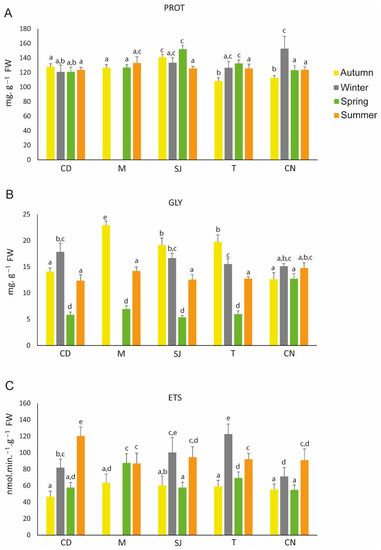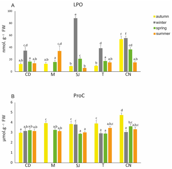 Lipid peroxidation (LPO) levels were significantly higher during winter, especially in SJ, where all of the LPO levels were significantly different among seasons. Additionally, the lowest levels of LPO were seen in summer in SJ. Generally, LPO levels were low during autumn, except in CN, where they were significantly higher (Figure 6A; Table S2). ProC was higher in all sites during autumn, except in CD, where no significant differences between seasons were observed. Additionally, in autumn, levels were significantly higher in CN. During winter in SJ, levels were higher compared to the other sites (Figure 6B; Table S2).