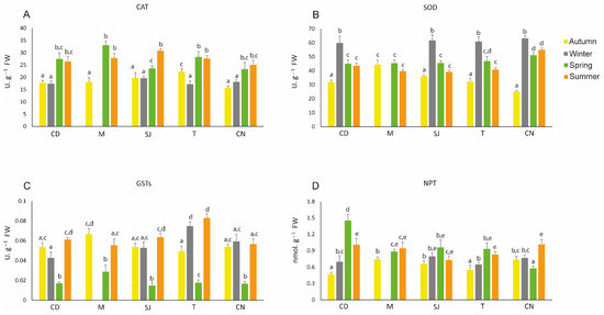 Antioxidant defences: (A) catalase (CAT), (B) superoxide dismutase (SOD), (C) glutathione S-transferases, and (D) non-protein thiols (NPTs) measured in Diopatra neapolitana in autumn 2018 and winter, spring, and summer 2019. Comparison between different seasons at the same site. Letters (a–e) represent significant differences between areas and seasons (p ≤ 0.05). CD: Cale do Ouro; M: Murtosa; SJ: São Jacinto; T: Torreira; CN: Costa Nova. Site M has no winter data.