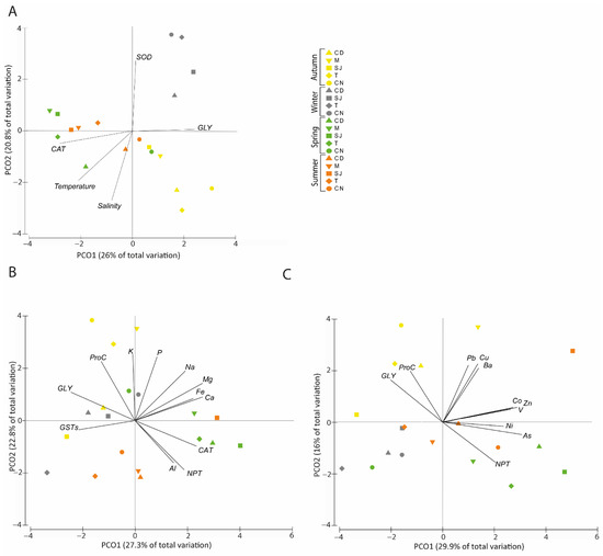 Regarding trace element accumulation on the soluble fraction and biochemical parameters, PCO analysis demonstrated that PCO1 explained 29.9% of total data variation, with the summer (except M and T) and spring (except CN) samples on the positive side being related to higher trace element (As, Ba, Co, Cu, Ni, Pb, V, and Zn) concentrations and NPT activity (Figure 8C). The winter and autumn samples on the negative side were mainly related to the biochemical parameters GLY and ProC. PCO2 explained 16% of the variation, with the samples from winter, spring, and summer (except site SJ) on the negative side being correlated with the As and Ni accumulation levels in the soluble fraction. Samples collected in autumn and from site SJ in summer were on the positive side of this axis and were correlated with Ba, Co, Cu, Pb, V, and Zn and GLY and ProC (Figure 8C).