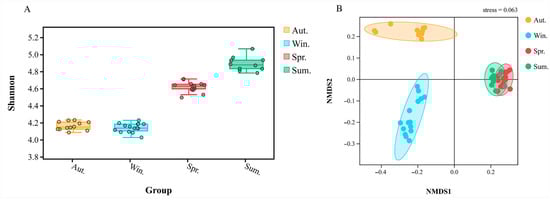 The differences in microbial alpha diversity could be caused by driving factors in a different environment. The box plot (Figure 5A), combined with grouping information and Shannon index, was drawn by using the test results of Tukey HDS. Therefore, we can find that the α diversity index from high to low was: winter, autumn, spring, and summer. On the whole, the four groups of samples had a low degree of dispersion and high stability.