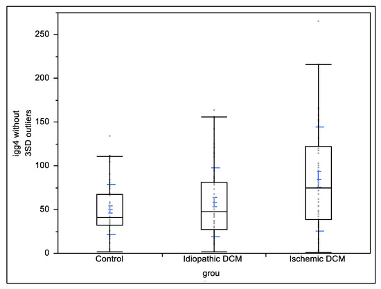 Comparison of IgG4 levels between patients with ischemic cardiomyopathy, non-ischemic cardiomyopathy, and control group. Black boxes represent interquartile ranges; blue bars represent mean and standard deviations.