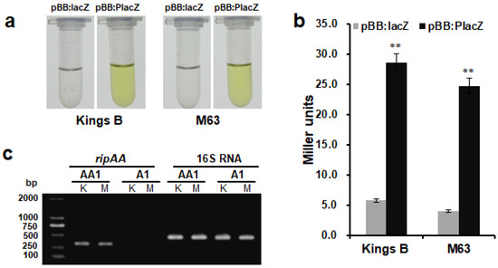Transcription of ripAA in P. mosselii AA1: (a) yellow color indicates β-galactosidase activity. The ripAA promoter was fused to lacZ in the pBBR1MCS-5 vector. The pBBR1MCS-5 vector with only lacZ was used as a negative control. After both constructs were introduced into P. mosselii A1, β-galactosidase activity was assayed in Kings B or M63 broth; (b) quantitative analysis of β-galactosidase activity driven by the ripAA promoter in P. mosselii A1. Error bars represent the standard deviation from three independent experiments. Differences were evaluated using Student’s t-tests (** p < 0.01); (c) semi-quantitative RT-PCR analysis of ripAA transcription in P. mosselii AA1. Total RNAs were isolated from cells grown in Kings B and M63 broths, and 16S rRNA was used as an internal control. DNA marker was DL2000 (TAKARA, Otsu, Japan). K: Kings B medium. M: M63 medium. Construction and verification of the engineered P. mosselii strain AA1.