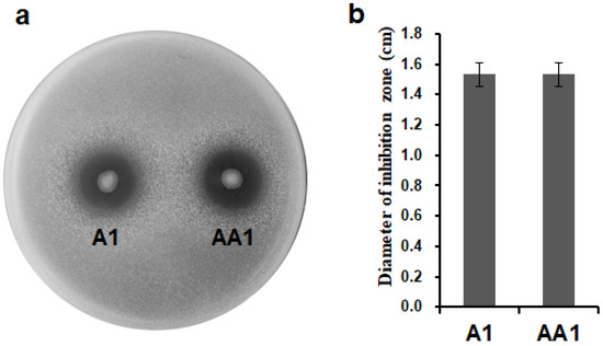 Antimicrobial activity of P. mosselii A1 and its mutant against Ralstonia solanacearum in a plate confrontation experiment: (a) plate confrontation on Ralstonia solanacearum by P. mosselii AA1. The cultured P. mosselii cells were prepared to OD600 = 1.5, and 2 µg of cell suspension was spotted on NA plates containing R. solanacearum. The inhibitory effect was recorded at 3 days post-inoculation; (b) diameters of inhibitory zones, as determined at 3 days post-inoculation from three replications. Error bars represent the standard deviation from three independent experiments.