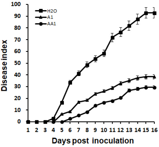 Progression of bacterial wilt on tobacco plants treated with AA1. The disease index was recorded daily from 0 to 16 days after wounded root inoculation. Each point represents the mean disease rate of 8 inoculated plants per treatment. Error bars represent the standard deviation from three independent experiments.