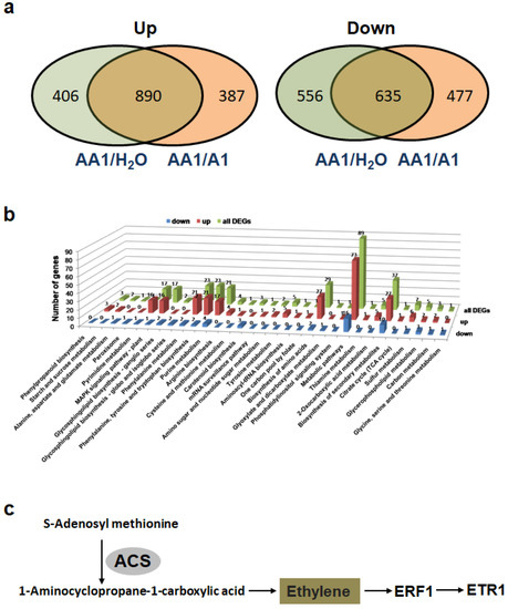 Identification of differentially expressed genes by RNA sequencing: (a) diagram showing the numbers of genes that shared the same patterns of transcriptional change. Genes with log2 fold change ≥ 1 and P ≤ 1 for the comparison between control and treated groups were determined using the DESeq2 package in R (version 3.3.2) and Cuffdiff v.2.2.156; (b) KEGG classification of differentially expressed genes; (c) induced genes involved in ethylene signaling pathway.