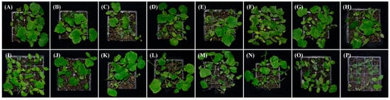 Control efficiency of antagonistic strains against bacterial soft rot disease on potted cucumbers. (A): ZF115; (B): ZF119; (C): ZF185; (D): ZF194; (E): ZF278; (F): ZF390; (G): ZF402; (H): ZF405; (I): ZF428; (J): ZF429; (K): ZF436; (L): ZF448; (M): ZF450; (N): ZF453; (O): Zhongshengmycin; and (P): Control of sterilized water.