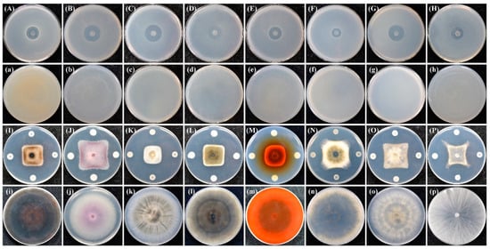 Antagonistic assay of Paenibacillus peoriae ZF390 against eight pathogenic bacteria and eight pathogenic fungi. (A) and (a): Pectobacterium brasiliense; (B) and (b): Xanthomonas campestris pv. campestris; (C) and (c): Pseudomonas syringae pv. tomato; (D) and (d): Clavibacter michiganensis subsp. michiganensis; (E) and (e): Pseudomonas syringae pv. lachrymans; (F) and (f): Clavibacter michiganensis subsp. sepedonicum; (G) and (g): Agrobacterium vitis; (H) and (h): Acidovorax citrulli; (I) and (i): Corynespora cassiicola; (J) and (j): Fusarium oxysporum; (K) and (k): Colletotrichum capsici; (L) and (l): Phytophthora capsici; (M) and (m): Stemphylium solani; (N) and (n): Ascochyta citrulline; (O) and (o): Botrytis cinerea; and (P) and (p): Rhizoctonia solani. Uppercase letters indicated the treatment; lowercase letters indicated the negative control.
