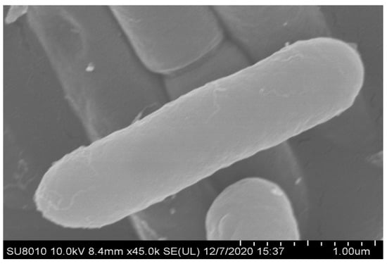 Strain ZF390 was demonstrated to be a motile, Gram-positive, and facultative anaerobic bacterium belonging to the Paenibacillaceae family. Strain ZF390 grew readily on LB plates at 28 °C and produced light yellow sticky colonies with irregular margins after 36 h of incubation (Supplementary Figure S4A), and the strain produced rod-shaped cells with a length of 2–4 μm and a diameter of 0.5–1 μm (Figure 3 and Supplementary Figure S4B). As indicated in the physiological and biochemical assays, casein was hydrolyzed by strain ZF390, but arginine dihydrolase and indole were not produced, and the nitrate reduction reaction was negative. Interestingly, the capability of strain ZF390 to liquefy gelatin was negative, which was the complete opposite of that of P. peoriae KCTC 3763T []. Acid was produced by ZF390 from the following compounds: glycerol, D-arabinose, L-arabinose, ribose, D-xylose, adonitol, methylxyloside, D-fructose, mannitol, methyl-D-mannoside, salicin, maltose, D-trehalose, gentiobiose, 2-keto-D-gluconate, 5-keto-D-gluconate, rhamnose, D-turanose, and N-acetylglucosamine, and its capacity of utilizing D-turanose was different from that of KCTC 3763T (Supplementary Table S1).